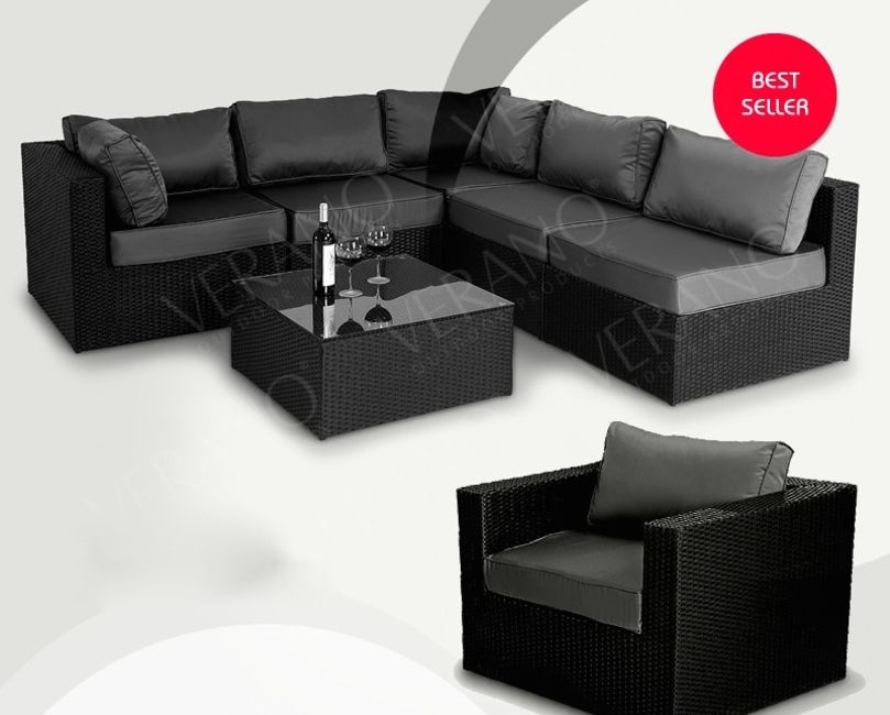 Brand New & Boxed Top Quality All weather Black Rattan Furniture 7 Piece Sofa Set with contrasting grey Upholstery Coffee table with tempered glass top