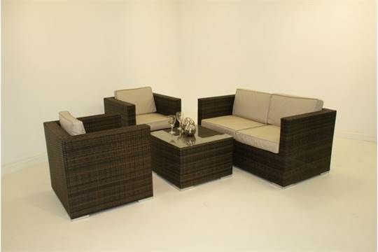 Brand New 4 piece multibrown all weather rattan, fully welded aluminium frame deep cream cushions, 2 seater sofa size 1580mm x 850mm, single chairs 850mm x 850mm, coffee table 760mm x 760mm , please note no legs sits completely on the floor for more stability