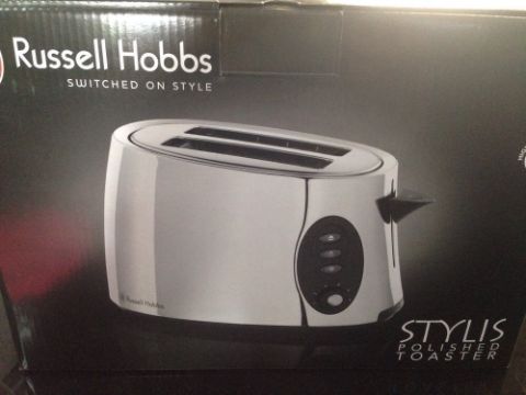 Russell Hobbs Stylis Polished Two Slice Toaster Brand New Brand new and boxed Russell Hobbs stylis polished chrome toaster. Cancel, frozen bread and reheat settings with blue LED indicator lights High lift function for ease of removing toasted bread. Removable crumb tray for easy cleaning. Variable browning control