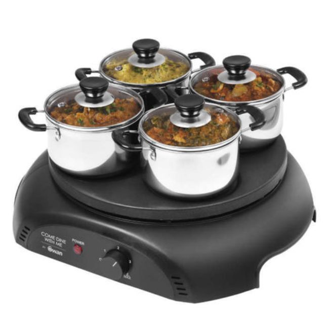 Brand New Swan Come Dine With Me CDWM Curry Station and Chapati Maker Teflon Non Stick You'll be the host with the most when you bring out the Swan Come Dine With Me Curry Station. Part of our new Come Dine With Me range designed to help you prepare mouth-watering starters and mains to delight your family and friends. There are 4 individual cooking pots with lids, so can keep a great selection of dishes warm at the table, as well as2 spatulas, ameasuring ladle and a batter spreader. Once the feast is over, the Teflon-coated non-stick cooking plate is simple and easy to clean. Useful info: Teflon coated non stick cooking plate 1000-watt power Easy to clean 4 individual cooking pots with lids Integrated place for accessories and the cord Comes with 2 spatulas 1 measuring ladle and batter spreader Swan Come Dine With Me Curry Station