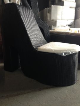 Black All Weather Rattan Shoe Style Chair with Cream Cushion Furniture Garden BRAND NEW AND EXCLUSIVE DESIGN Black Rattan Shoe Style Chair with cream cushion. For those that like to bring a unique style to their outdoor living space we bring you this high quality black rattan shoe style chair with cream cushion. Guaranteed to bring you that wow factor!! Strong powder coated aluminium frame for complete rust, uv and anti fade resistance. Measures 68x148x120cm