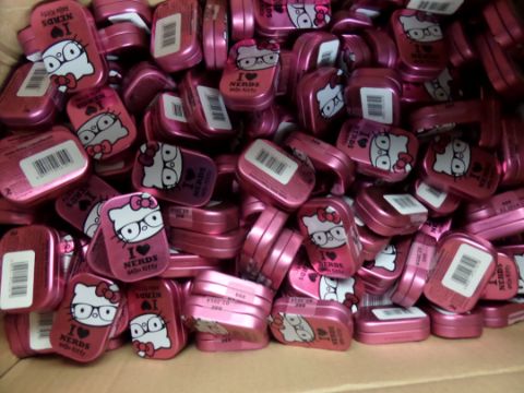 1 x Pallet to include approx. 2,000 x Hello kitty peppermint tins, each tin is filled with peppermint sweets. Tin is re-usable. Come in various designs. Past best before(02-14). RRP £2,000!
