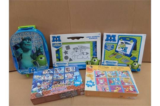 1 x Pallet to contain 36 items of BRAND NEW TOYS. To include: 6 x Monsters University 5 Piece luggage sets (each set includes: pull along case, gym bag, back pack, filled pencil case and a wallet) 12 x Monsters university Travel art easels. 6 x Monsters university large magnetic scribbler. 6 x Tom a