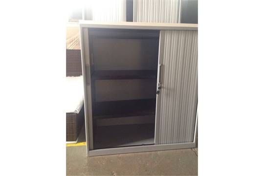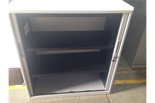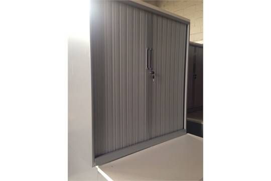 5 x Grey Medium Tambour Roll Door Storage Office Filing Cabinet With Shelves And Key Used But in Great Condition Provides and attractive, secure and efficient filing and storage option for your business The tambour door roller shutter recede smoothly into the cabinet sides making this an ideal option for limited spaces, aisles or areas Complete with shelves that can be moved to filing height required Designed with style in mind offering total functionality for the modern office or home space Premium executive quality storage developed for commercial use Cabinet Measures: H 110cm L 100cm W 48cm Extra shelves available at a small cost
