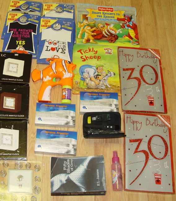Over 70 items of which about 5 to 10% may be returns, some damaged boxes but mostly new items, all easy sellers. Straight off the shelves of a retail shop. RRP. Approx. £200 to £300. Can post at the cost of £15.00 FULLY INSURED AND TRACKED.. NO VAT. SEE PICS