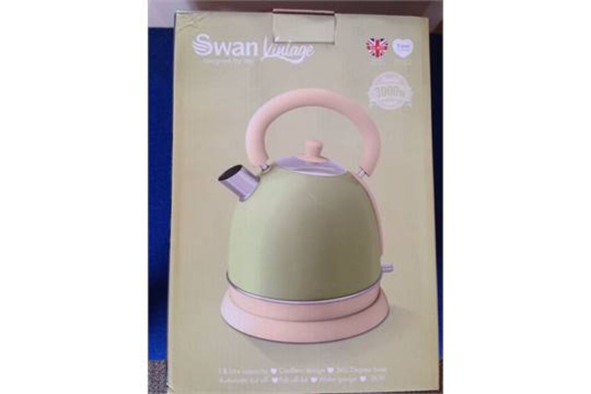 Brand New and Boxed Swan Vintage Retro Dome 1.8L Kettle Green Cordless design with 360 degree base Automatic cut off, pull-off lid and water gauge 3 KW rapid boil This kettle has a capacity of 1.8 litres Swan provides 2 year guarantee