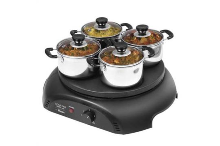 Brand New Swan Come Dine With Me CDWM Curry Station and Chapati Maker Teflon Non Stick You'll be the host with the most when you bring out the Swan Come Dine With Me Curry Station. Part of our new Come Dine With Me range designed to help you prepare mouth-watering starters and mains to delight your family and friends. There are 4 individual cooking pots with lids, so can keep a great selection of dishes warm at the table, as well as2 spatulas, ameasuring ladle and a batter spreader. Once the feast is over, the Teflon-coated non-stick cooking plate is simple and easy to clean. Useful info: Teflon coated non stick cooking plate 1000-watt power Easy to clean 4 individual cooking pots with lids Integrated place for accessories and the cord Comes with 2 spatulas 1 measuring ladle and batter spreader Swan Come Dine With Me Curry Station