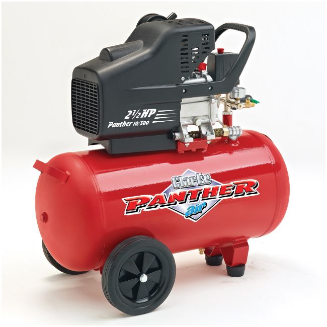 Panther 10/500 High output direct drive air compressor. Suitable for workshop and DIY applications such as spraying (paint, varnish, preservatives etc.), nailing, stapling, polishing, sanding and garage use. With twin air outlets for increased versatility. 2.5hp 50Hz Motor - 230V 50 Litre Air Reciever Capacity 9.5cfm air displacement 8 bar (116psi) maximum pressure Fully automatic on/off control - Fitted with safety valve and pressure regulator with gauge for controlled air pressure Wheel Mounted Dimensions (LWH): 720x390x607mm - Weight: 27.4kg