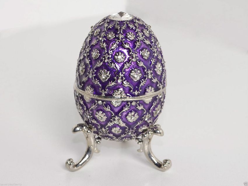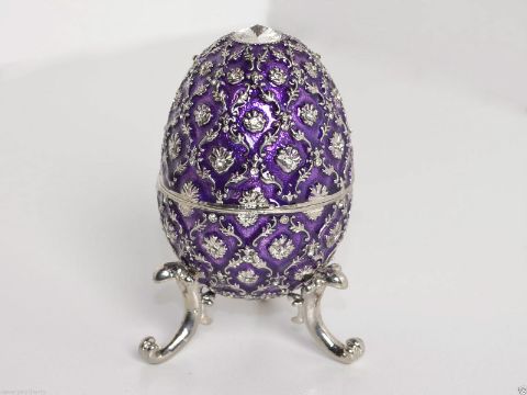 Treasured Trinkets - Musical Purple Egg. Widdop Bingham ref code 15249. What a stunning egg trinket box! This large purple trinket box Is made of heavy enamelled metal. The box is covered in a silver Fleur De Lys pattern and has a large crystal on the lid and base. The interior is lined with purple felt. And its musical! It plays a piece from Swan Lake. What is not to love! Treasured Trinkets is a range of quirky and fun trinket boxes made from die cast metal and hand painted using colourful epoxy and sparkly crystals. Each item opens to reveal a miniature trinket box for storing special items such as jewellery or coins etc. Each piece is presented in a high quality silk lined gift box. New designs are coming out regularly so you can add to this wonderful collection of over 200 designs. Dimensions: H9 x W7 x D7cm Material: Die cast metal Colour: Purple Silk lined gift box Hand painted with epoxy Decorated with crystals COLLECTION AVAILABLE OR DELIVERY £3