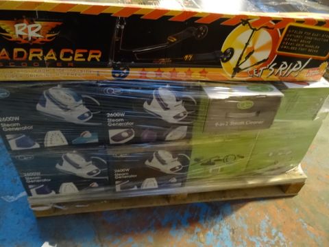1 x HIGH VALUE (HV9) Pallet to contain approx 17 items to include: 4 x Quest 1400w Bagless cyclonic vacuum cleaners, 8 x Quest 2600w Steam Generating Irons, 2 x Quest 9 in 1 steam cleaners, 1 x Road Racer scooter, 1 x 2 in 1 Handheld vacuum and 1 x Multi function cooker. High Retail Value! Unchecked/UNTESTED BOXED CUSTOMER RETURNS