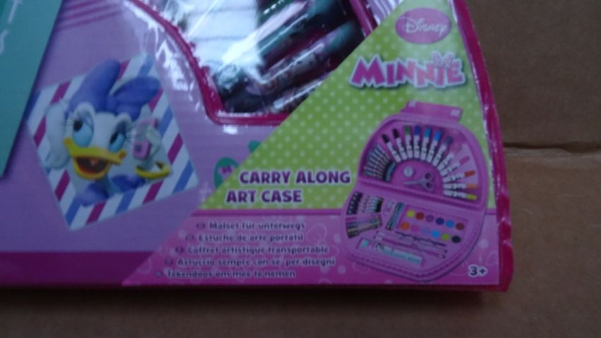 24 x Disney Minnie Mouse Carry Along Art cases. Each includes: 1 x Carry case, 12 x Markers, 12 x Crayons, 12 x Paints, 1 x Paintbrush, 1 x Mixing Tray, 6 Coloured pencils, 2 x HB Pencils, 1 x Eraser, 1 x Sharpener, 1 x Ruler and 1 x Scissors. BRAND NEW stock! Very high retail price