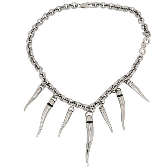 Model Number: DJ0028 Product Name: Ladies D&G Pepper Necklace With Seven Horns (By D&G Jewels) Product Subtitle Gioielli D&G Pepper Collana Con 7 Corni Product Summary D&G silver necklace with chain and pendants in the shape of a horn, with lobster clasp closure. Product Description Ladies stainless steel necklace with chain and pendants in the shape of a horn.  Lobster clasp closure. Silver colour peppers go with any outfit and colour. Classic and timeless Italian design. D&G logo on necklace._x00D_ Type: Necklace Gender: Ladies Size: One size Colour: Silver Length: 38 cm / 15 inches Material: Stainless steel Shape: Horn Original RRP: £199 Manufacturer : Dolce & Gabbana Collection: Gioielli D&G Jewels Packaging: Complete with white and black D&G box & booklet. Boxed Product Weight: 141g (5 oz)_x00D_  _x00D_ Packaging: Complete with white and black D&G box & booklet. _x00D_  _x00D_ Boxed Product Weight:    141g (5 oz)_x00D_