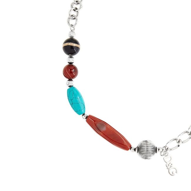 Ladies D&G Multicoloured “Pebble” Necklace (By D&G Jewels). RRP £ 159 Brand New & Boxed_x00D_ Model Number: DJ0855_x00D_ Product Name: Ladies D&G Multicoloured “Pebble” Necklace (By D&G Jewels)._x00D_ Product Summary_x00D_ Ladies multicoloured necklace from D&G “Pebble” collection (DJ0855)._x00D_ Product Description_x00D_ Ladies D&G necklace with polished stainless steel chain and silver D&G logo. Colourful assortment of agathe, marble, turquoise and fluted adornments. Stand out from the crowd – this necklace is distinctive and elegant in equal measure. Matching bracelet from same collection also available (DJ0857)._x00D_ Type: Necklace Gender: Ladies Size: One size. Colour: Turquoise, silver, marble and different shades for brown. Length: 100 cm / 39 inches. Material: Stainless steel (nickel free). Shape: Balls and ovals (various sizes) Original RRP: £159 Manufacturer : Dolce & Gabbana Collection: Pebble (D&G Jewels). Packaging: Complete with white and black D&G box, pouch & booklet. Boxed Product Weight: 521 g (18.4 oz)