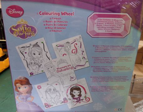 12 x Sofia the First 110 piece Colouring wheel. BRAND NEW AND PACKAGED. RRP £300! Each includes: 14 x oil pastels, 13 x colouring pencils, 12 paints, 11 crayons, 10 markers, 5 colouring sheets, 2 paint brushes, 2 mini self inking stampers, 2 paint tubes, scissors, sharpener and eraser!!