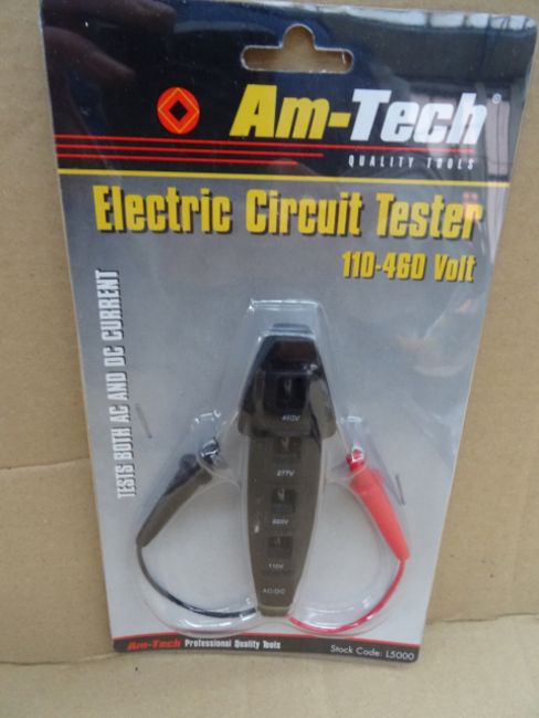 48 x Am-Tech Quality Tools. Electric Circuit Tester. 110-460 Volt. Tests both AC and DC Current. Multi Voltage 4 way current tester, with re-inforced casing and test leads. Features 4 Settings 110v, 220v, 277v and 460v. Positive and negative colour coded leads. BRAND NEW and Packaged! Fast moving stock. Very high retail value!