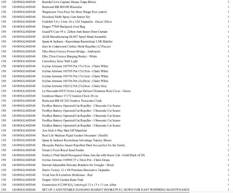 1 Pallet of Garden Products - Full breakdown shown in images - Pallet Number - 141003GL86D340 Total Units 126