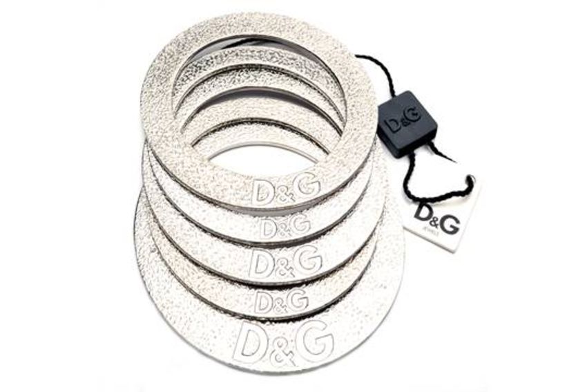 Model Number: DJ0822_x00D_ Product Name: Ladies Silver Plated Wisp Bangles (By D&G Jewels)._x00D_ Product Summary_x00D_ Ladies D&G silver plated brass bangles – set of five (Wisp Collection)._x00D_ Product Description_x00D_ Ladies D&G silver plated brass bangles (DJ0822). Set of five matching bangles (in graduated sizes). Textured surface with D&G logo engraved on each individual bangle. Add a splash of razzle dazzle to that special occasion!_x00D_ Type: Bangles Gender: Ladies Size: Uniform (the five bangles come in graduated sizes). Colour: Silver plated. Material: Brass Shape: Oval Original RRP: £149 Manufacturer: Dolce & Gabbana Collection: Wisp (D&G Jewels). Packaging: Complete with white and black D&G gift box, pouch & booklet. Boxed Product Weight: 266 g (9.4 oz)