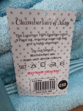 1 x Chamberlain & May 9 Piece Luxurious (AQUA) 100% Egypian cotton Towel Bale. Price Marked at £60! Includes: 2 Bath towels, 2 Hand towels, 1 Bath Sheet and 4 Face Cloths. Brand new. High quality egyptian cotton set, super soft feel and highly absorbant!