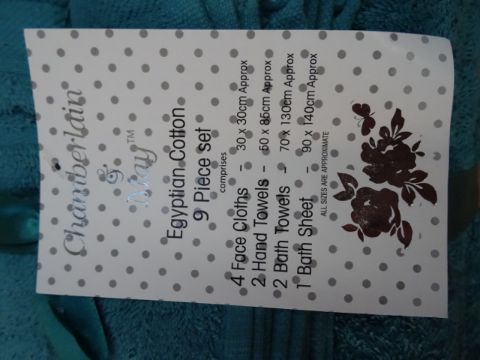 1 x Chamberlain & May 9 Piece Luxurious (TEAL) 100% Egypian cotton Towel Bale. Price Marked at £60! Includes: 2 Bath towels, 2 Hand towels, 1 Bath Sheet and 4 Face Cloths. Brand new. High quality egyptian cotton set, super soft feel and highly absorbant!