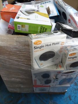 1 x Large Pallet (33) Appox. 4 Foot high to contain various customer returned stock such as: double and single hot plates, r/c plane, oil filled radiators, table top table tennis, 360 degree r/c ball, cordless home phone, steam mop cleaner and much more. Approx RRP £1,250! Unchecked/Untested customer returned stock.