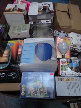 1 x Large Pallet (38) Appox. 4 Foot high to contain various customer returned stock such as: heaters, dancing water speakers, cloths dryer, dual projectors, soup maker, foot warmer and massager and much more. Approx RRP £1,250! Unchecked/Untested customer returned stock.