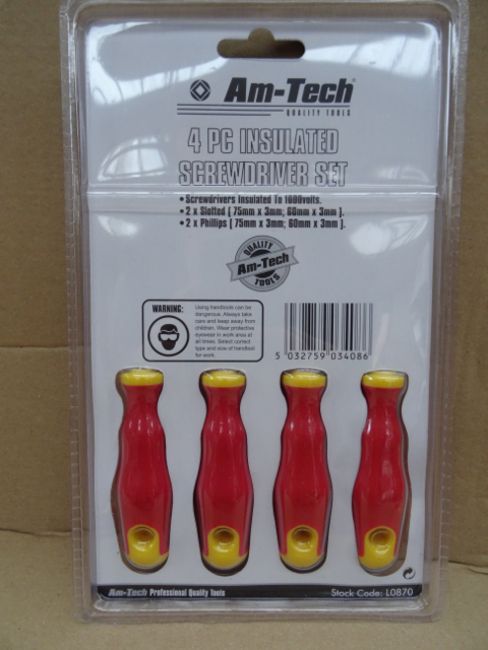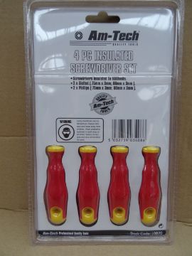 48 x Am-Tech Quality Tools. 4 Piece Insulated Screwdriver sets. Insulated to 1000 Vots. 2 x Slotted and 2 x Phillips. Very High Retail value. Fast moving stock! BRAND NEW and PACKAGED Stock!!