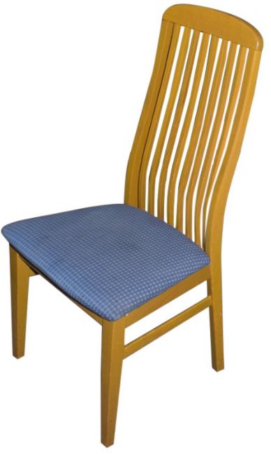 25 x Blue Upholstery Slat Back Dining Chairs Seat Height: 40 Back Height: 101 Width: 48 Depth: 47 All sizes are in CM.