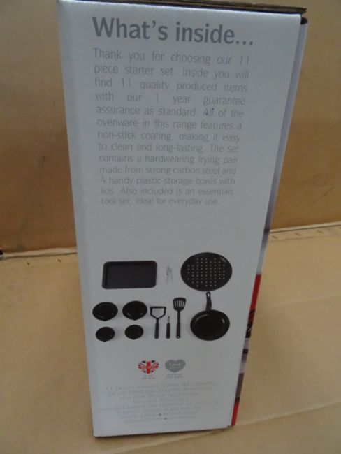 4 x Swan 11 Piece Kitchen Cookware sets. Each includes: 24cm Frying pan, non stick 33cm pizza crisper, non stick baking tray, 4 plastic storage bowls with lids, potato peeler, slotted turner, potato masher and tin opener! Brand new and boxed. High quality! Very high retail value! UK Delivery £12 + VAT (combined postage available, please ask for a quote after you recieve your invoice.)