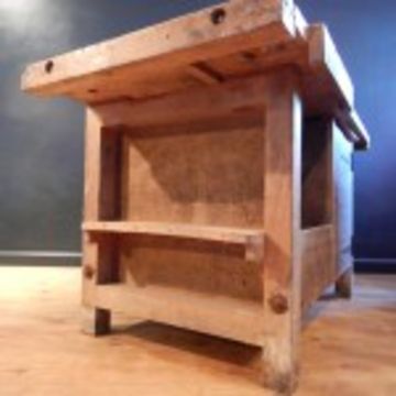 WORKBENCH. Condition: Workbench with Stamped top, character wear, two vice included, later addition of doors.