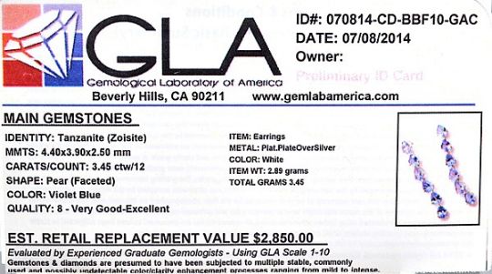 3.45 carat Pear Cut Tanzanite And Platinum Over Silver Earrings