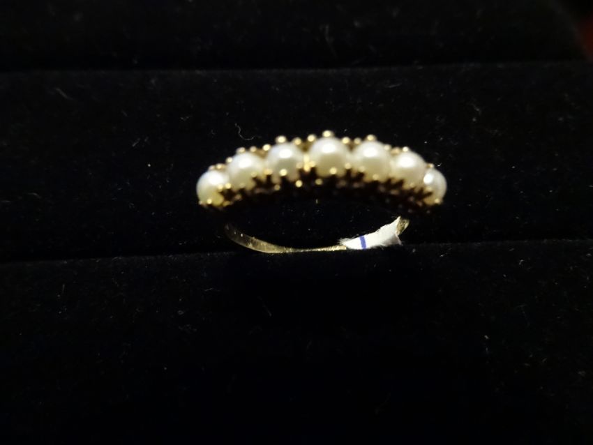 9 Carat Yellow Gold Ladies Ring, with 7 Pearl looking stones, Very nice looking piece! High quality weighing approx 1.95 grammes. Great mothers day present!