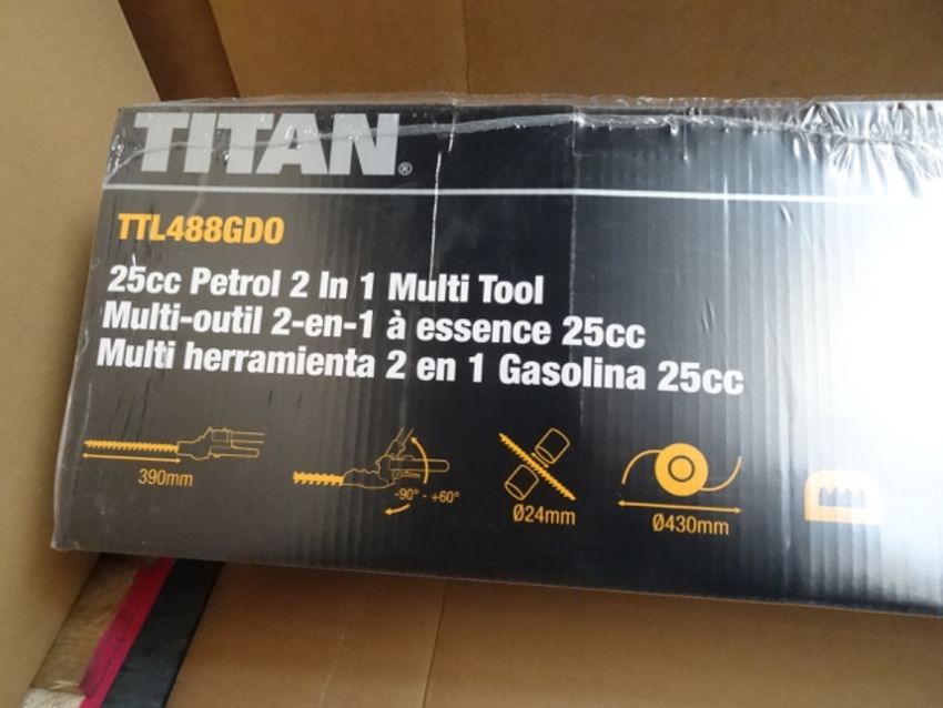 1 x Titan TTL488GDO 25cc Petrol 2 in 1 Multi Tool. 390mm cutting length, 24mm max cutting capacity, adjustable cutting angle, soft grip handle, 430mm cutting width! Brand new and boxed(please note box is slightly damaged) Approx RRP £179!!