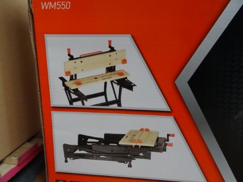 1 x Black and Decker Workmate WM550 foldable work bench! 610mm vice jaw length and 3 vice jaw positions, durable steel construction, dual working heights allows use as a work bench, bench tool stand, vice or saw horse! Brand new and boxed with slight scratch and box damaged! Very high retail value!