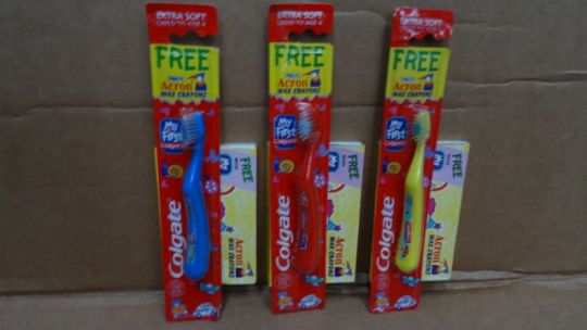 144 x Colgate 'My First ToothBrush' with crayons. Extra soft tooth brush for children aged up to 4 years. In various colours: yellow, blue, red. Brand new and Sealed! Manufacturers RRP £2.99 each. Total RRP £430.56