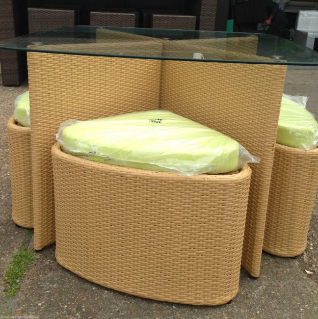 brand new four leaf clover all weather rattan table set This unique four leaf clover all weather rattan table set is ideal for garden, patio or home use. The set included four leafed shaped chairs four green cushions and a tempered glass table top. It is also very easy to store if you wish but can be used all year round This set is sure to give your home the wow factor Product Specifications: One Table Measures: 100x100x73cm Four Chairs each measuring: 61x44x42 The table and chairs are shaped to look like a four leaf clover Removable green cushions which are shower proof and machine washable Strong powder coated aluminium frame for full rust resistance High quality resin weave UV resistant and anti fade Table boasts fully woven tempered safety glass