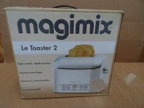 1 x Magimix le Toaster 2. Magimix Le Toaster 2 is a professional quality toaster that can brown all manner of bread, teacakes, crumpets and bagels, thanks to its wide slots (L14.4 x W3.7 x D12.5cm). Thanks to the auto-centre function your toast will be evenly brown and, with the variable browning control and choice of 1- or 2-sided toasting you’ll enjoy your breakfast even more. Other handy features on the Magimix Le Toaster 2 include a bell to warn you when it’s ready, soft-touch opening crumb tray, backlit controls. RRP £130!! Unchecked/Untested boxed customer return!
