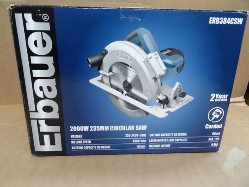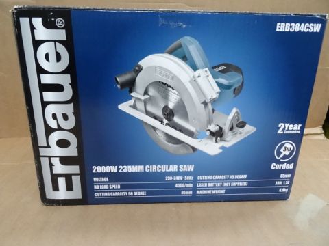1 x Erbauer ERB384CSW 2000W 235MM Circular Saw. Professional saw with laser and parallel guide, spindle lock and comfortable soft grip handle. Supplied with carry case, blade, hex key and dust collecton adaptor. Very high retail value! Brand new and Boxed! (packaging may be slightly damaged, this is no affect to the actual item whatsoever!)