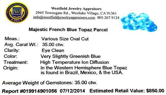 10 Oval Cut Majestic French Blue Topaz = 35 carat with eye clean clarity, Fantastic for bespoke jewellery and investment Appraised by experienced jewellery appraisers $850.00 approx £570.78 (12th July 2014)_x00D_ This collection is classified grade 1 type 2 GIA Coloured Stone Clarity grades top to bottom: Eye clean - appears clean to the unaided eye. Slightly included - minor inclusions somewhat easy to see with the unaided eye. Moderately included - Noticeable inclusions apparent to the unaided eye. Heavily included - prominent inclusions that have a negative effect on either appearance, or durability. Severely included - prominent inclusions that have a severe effect on appearance, durability, or both. * Translucent * Opaque Clarity types: Gem minerals form from several different geological processes. Gems produced by some of these processes tend to have more inclusions than those produced by other processes. For this reason, each gem species or variety has a range of clarity normally seen in the jewellery trade. Clarity ranges can be conveniently grouped into three Clarity Types. These apply only to transparent, non-phenomenal minerals (and colour change minerals) that normally appear in the market as faceted gems. This collection: Classified Type 2: Stones that are usually included. Stones with minor inclusions visible to the unaided eye are often faceted for use in jewellery.