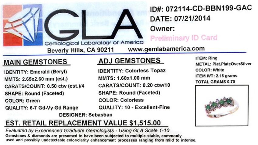 Designer Sebastian 4 x Round Cut Green Beryl Emerald gemstones = 0.50 carat And 10 x round cut Topaz gemstones = 0.20 carat Platinum Over Silver Ring