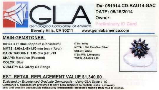 13 x Marquise Cut Blue Sapphire gemstones = 1.85 carat And Platinum Over Silver Ring, size M