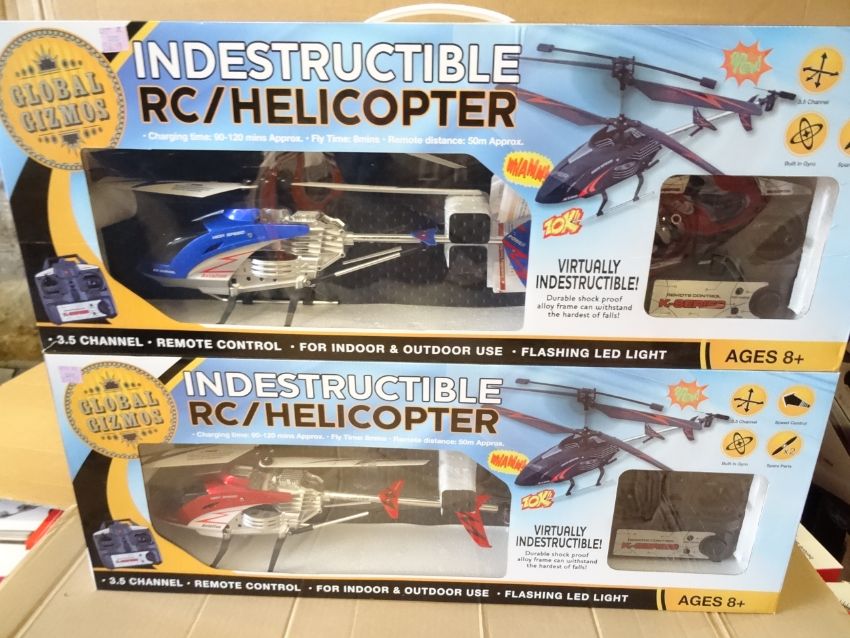 2 x Global Gizmos Indestructible Remote Control Helicopters. Fly time up to 8 minutes, Remote distance 50m approx. 3.5 Channel, For indoor and outdoor use, flashing LED light. RRP £60 each! Total RRP £120! Unchecked/Untested boxed customer returns!