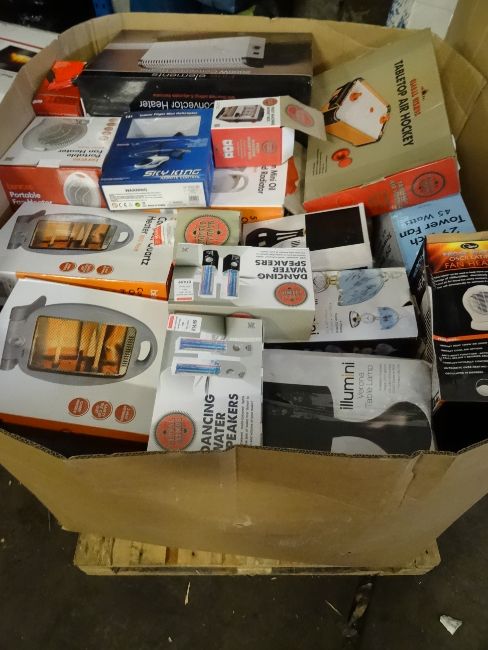 1 x Large Pallet (A32) to contain various items such as: r/c helicopter, dancing water speakers, illumini lamps, table top air hockey, red hot hair dryer, fan heater, fruit machine money box and much more. Approx RRP Value £1,115! Unchecked/Untested boxed customer returns!