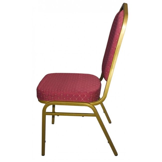 100 x Burgundy Steel Banqueting Chairs - BRAND NEW Brand new & unused. Made with a burgundy upholstery with a gold fleck. These banqueting chairs will suit a conference center well. Our banqueting chairs have the following features; Superior fabric and a dense foam that will last a lifetime. Both the foam and fabric meet the UK CRIB5 contract standard fire regulations. Will stack to 13 chairs high, we do not recommend going any higher. Plastic preventitive feet glides to protect your floors from scratching and scraping. No assembly needed, they are ready to be used as soon as you remove the packaging. Using a 2.5 inch high density foam for the seat pads our chairs will be comfortable yet will not loose shape over time. A support brace on either side for extra strength and durability. Plastic bumper guards are fitted to the legs to prevent damage to the legs whilst stacking. A 20mm square, 1.2mm thick iron frame allows the chairs to be very sturdy and hard wearing.