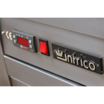 1 x Infrico 2 Door Fridge Stainless Steel Worktop There are some dents to the top surface of the worktop as seen in the photos Height: 94 Width: 147 Depth: 62 All sizes are in CM.