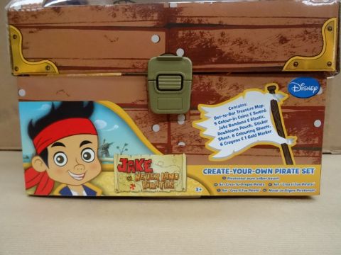 1 x Pallet to contain 240 x Disney Jake the Neverland Pirate Create Your Own Pirate Set. RRP £20 Each! Total RRP Value £4,800!! Brand New and Boxed Stock! Includes: Dot to dot treasure map, 5 colour in coints and sword, jake bandana, doubloons pouch, sticker sheet, 6 colouring sheets, 6 crays, gold marker and jake carry along treasure chest! High quality fast selling line!