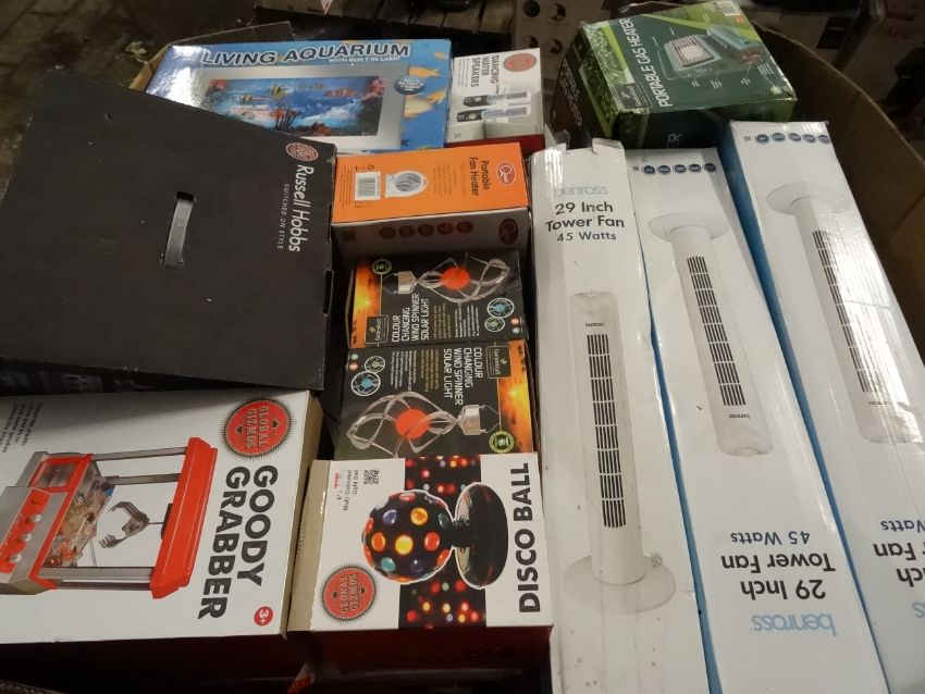 1 x Large Pallet (R44) to contain a large quantity of various items such as: 29 inch tower fans, dancing water speakers, dancing cool cat, living aquarium, disco balls, goody grabber, solar lights and much more. Unchecked/Untested customer returned stock. Total original RRP Value £1,209!