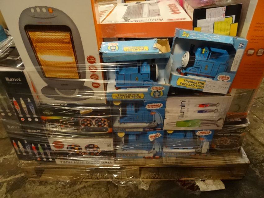1 x Large Pallet (R16) to contain 60 items such as: thomas the tank led torches, illumini lava lamps, disco balls, candy floss makers, dual laser projectors, mini atm machine and much more. Unchecked/Untested boxed customer returned stock. Total original RRP Value £1,550!
