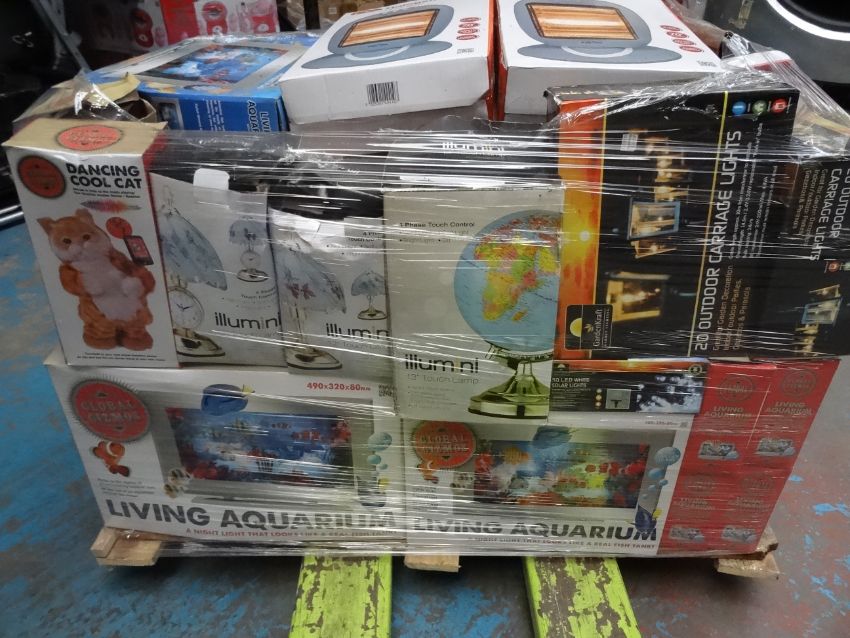 1 x Large Pallet (R53) to contain approx. 70 items to include: hand held steam cleaner, living aquarium, carrige lights, solar lights, illumini lamp, dancing cool cat, dunk the duck game and much more. Total Pallet RRP £1,409! Unchecked/Untested boxed customer returns!