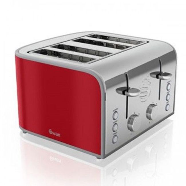 BRAND NEW BOXED WITH A 2 YEAR GURANTEE -SWAN RED RETRO VINTAGE 1600 WATT 4 SLICE STAINLESS STEEL ELECTRIC TOASTER Electronic browning control with defrost, reheat and cancel buttons Removable crumb tray and high lift Power - 1600 watt Automatic shut off with red indicator lights Swan provides 2 year guarantee
