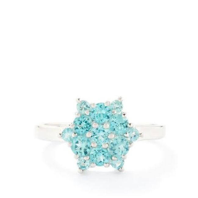 An Amazing 13 x Round Cut Madagascan Blue Apatite Gemstones = 1.09 carat, Clarity VVS, Eye clean 1, Excellent cut, silver ring, size N-O Gemstone variety: Madagascan Apatite Weight: 1.09 cts. Colour: 113 - medium light very strongly bluish Green; Clarity: VVS, Eye clean 1 Cut: Excellent Shape: Round. Comes complete with Black presentation box